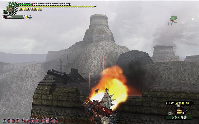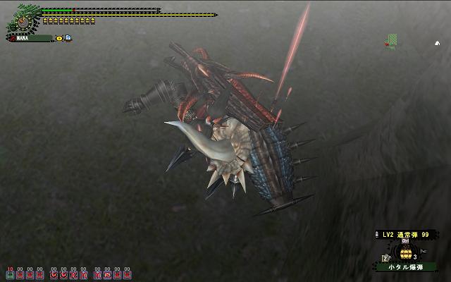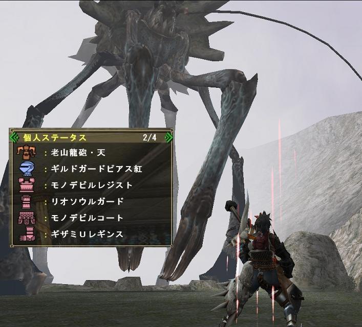 持ち物:調合書1 調合書2 調合書3 調合書4 力の護符 力の爪 小タル爆弾 回復薬 カラの実 カラ骨【小】 ランポスの牙 イーオスの毒牙 通常弾3 貫通弾1 貫通弾3 毒弾2 火炎弾